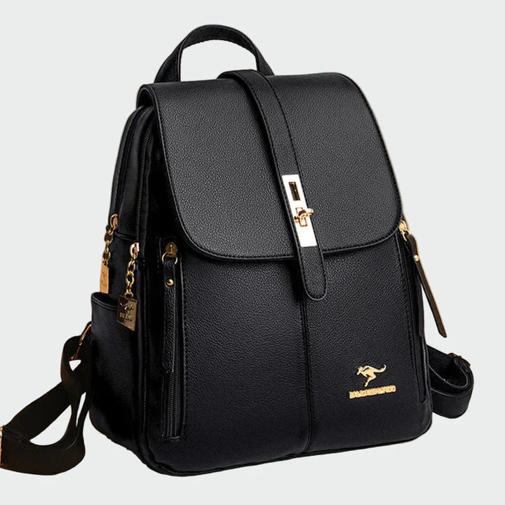 Eleganten črn nahrbtnik s sofisticiranim dizajnom, ki združuje stil in praktičnost. Pokrov z zlatimi kovinskimi detajli dodaja luksuzni pridih, medtem ko več zunanjih žepov z zadrgo omogoča enostavno organizacijo. Nastavljivi trakovi zagotavljajo udobno prileganje, kar ga dela idealnega za vsakodnevno uporabo in elegantne priložnosti.