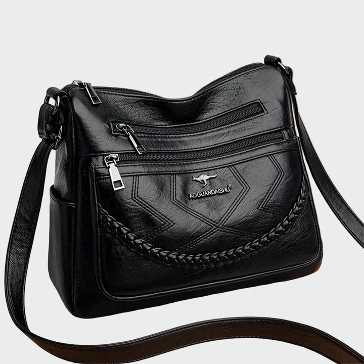 Eleganten črn nahrbtnik z edinstveno pletenico na sprednji strani, ki mu daje poseben značaj. Opremljen je z več zunanjimi žepi z zadrgo za hitro in enostavno organizacijo vaših potrebščin.