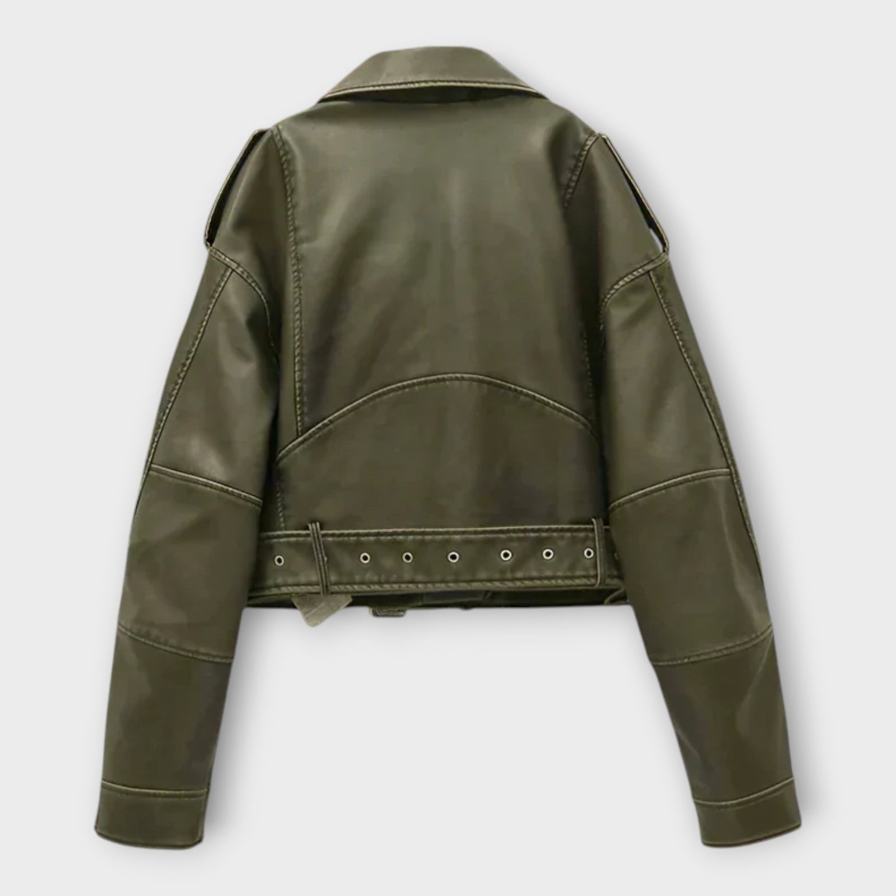 Moderna kratka usnjena jakna s pasom in dovršeno estetiko
