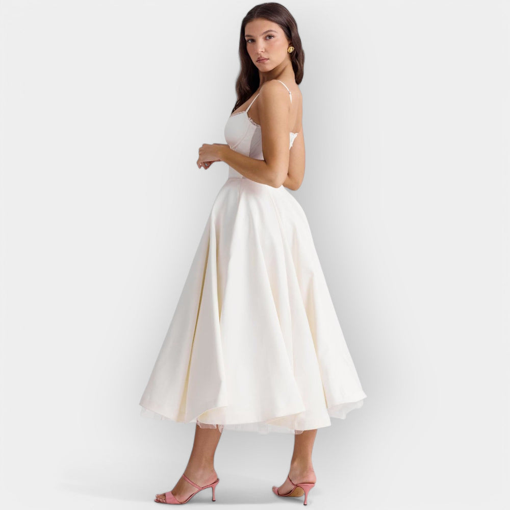 Midi obleka z odprtim hrbtom in korzetnim stilom